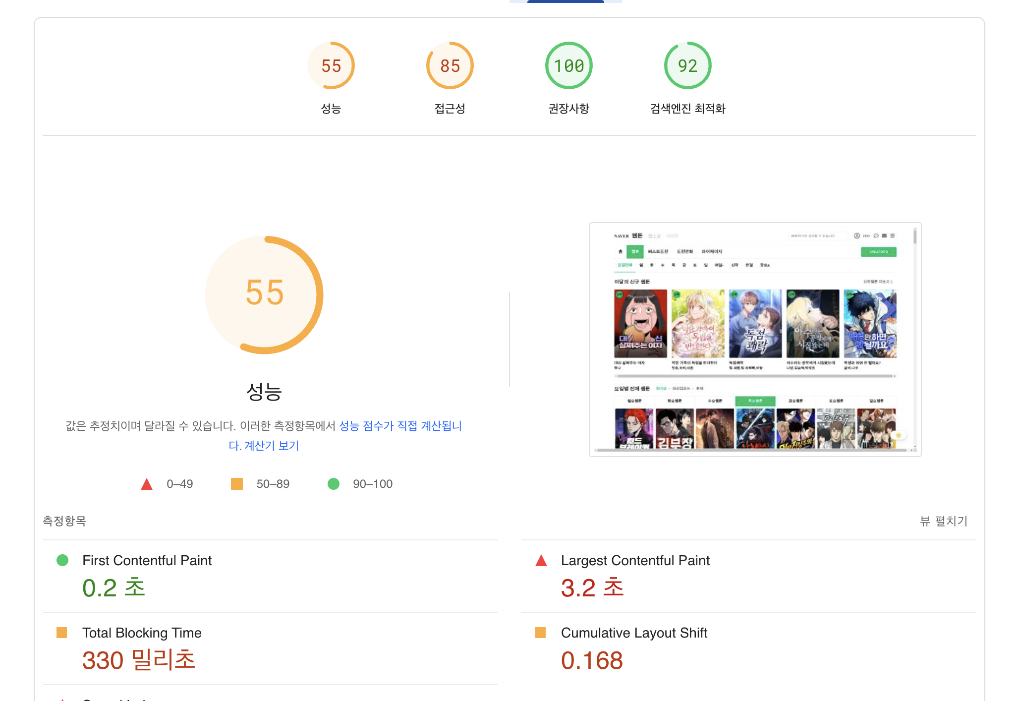 before & after 이러한 최적화를 통해 36점에서 55점으로 개선된 것을 알 수 있다.